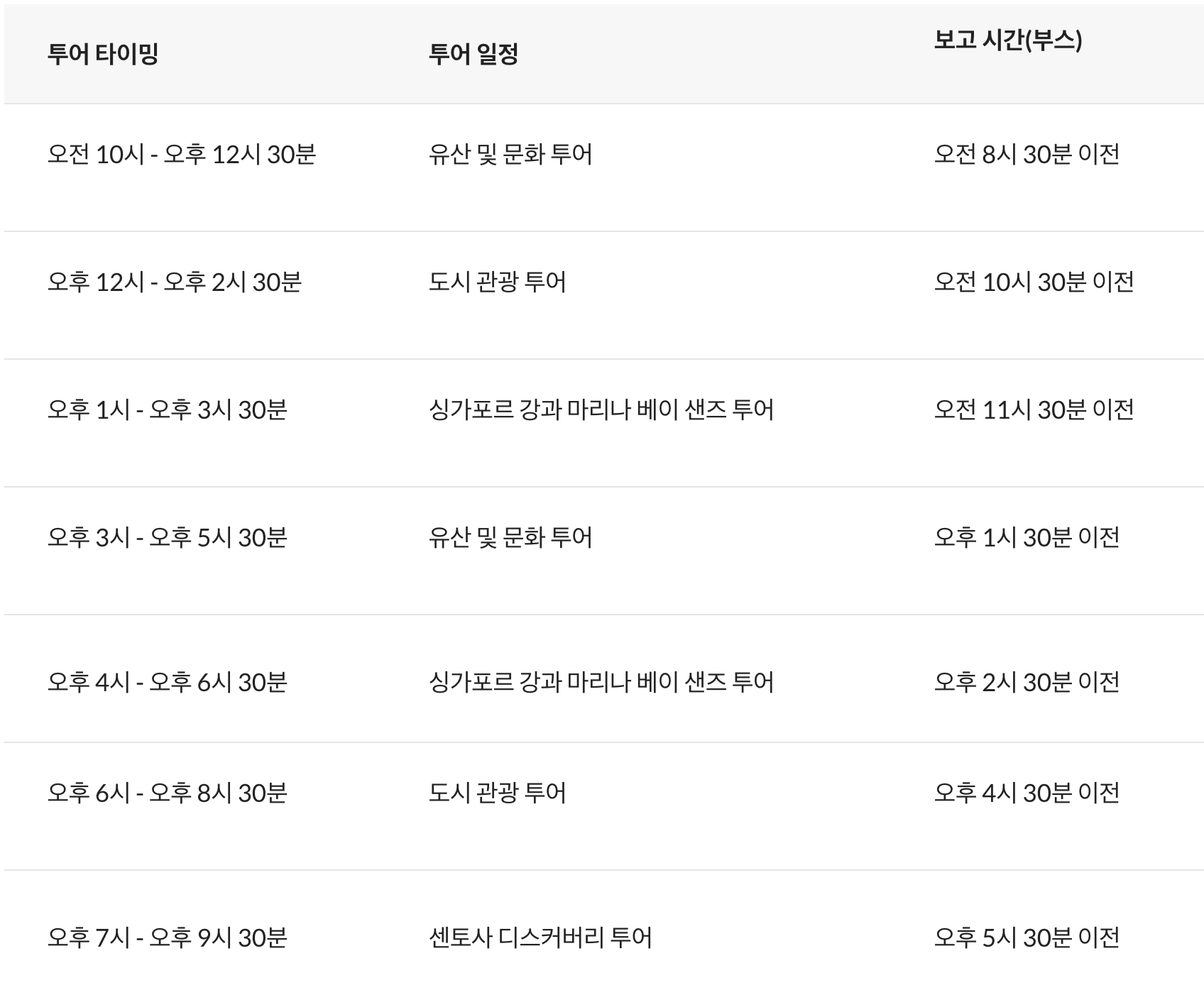 - 준비물: 여권, 탑승권, 기내용 짐, 편한 신발. (투어 부스에서 짐을 맡아주지 않습니다!)